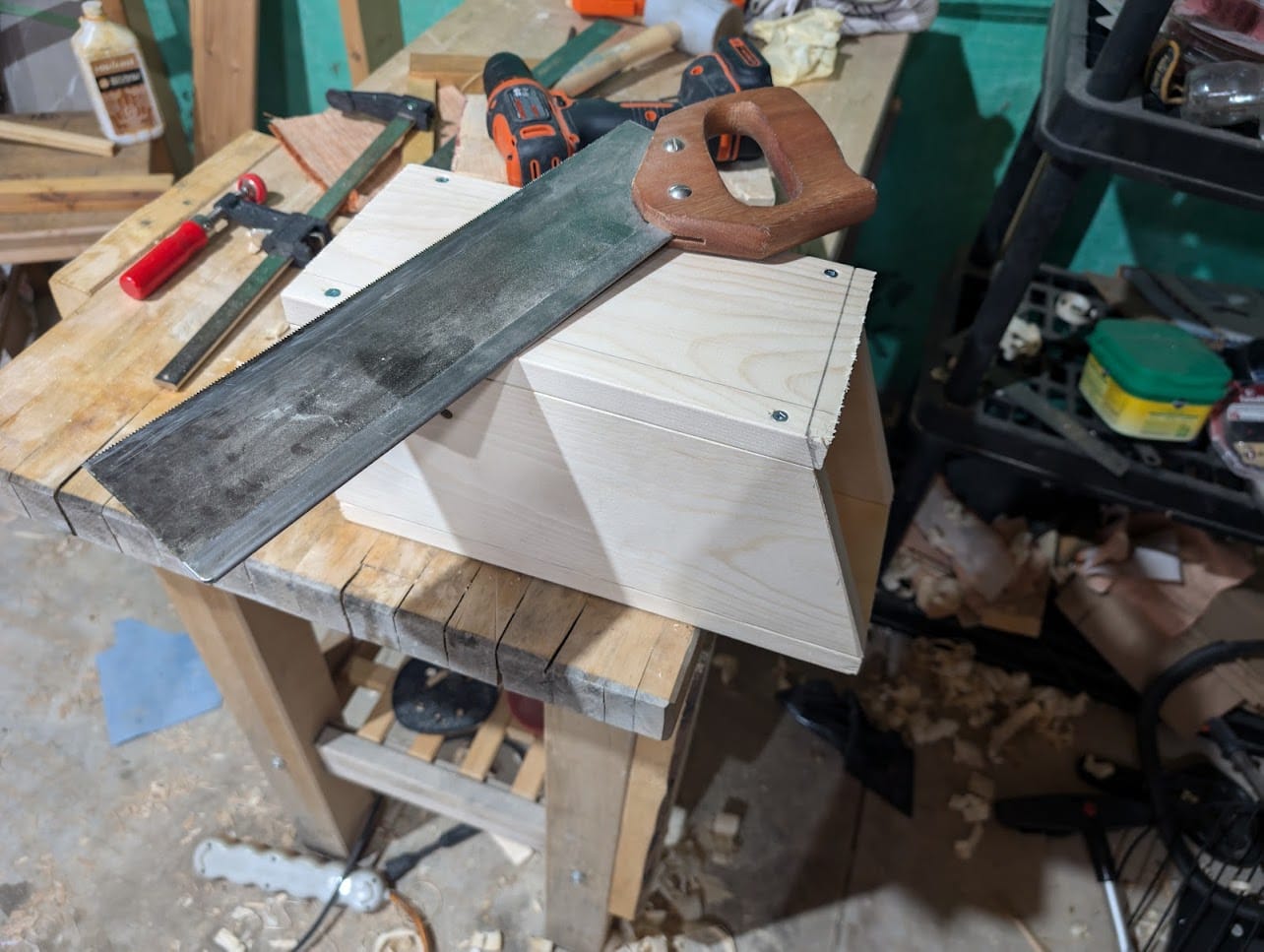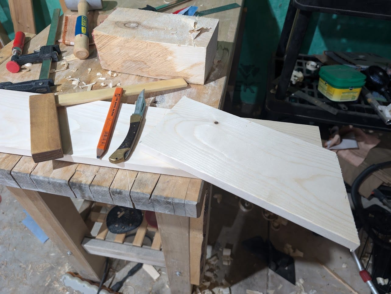 Usé la vieja sierra de marco de mi abuelo, una herramienta que trajo de Alemania hace años, probablemente más antigua que yo. Anteriormente había aprendido a afilarla, lo cual la hizo mucho más efectiva. Me dio gusto usarla para este proyecto. Además, utilicé una escuadra que hice yo mismo, una de las primeras herramientas que construí, para marcar las líneas de mis cortes. Para suavizar y refinar los bordes, utilicé mi cepillo de mano de confianza, lo que ayudó a darle a la casita un aspecto acabado y prolijo. Para el ensamblaje, usé tornillos Robertson de dos pulgadas y, para asegurarme de que la madera no se partiera, perforé previamente todos los agujeros necesarios.