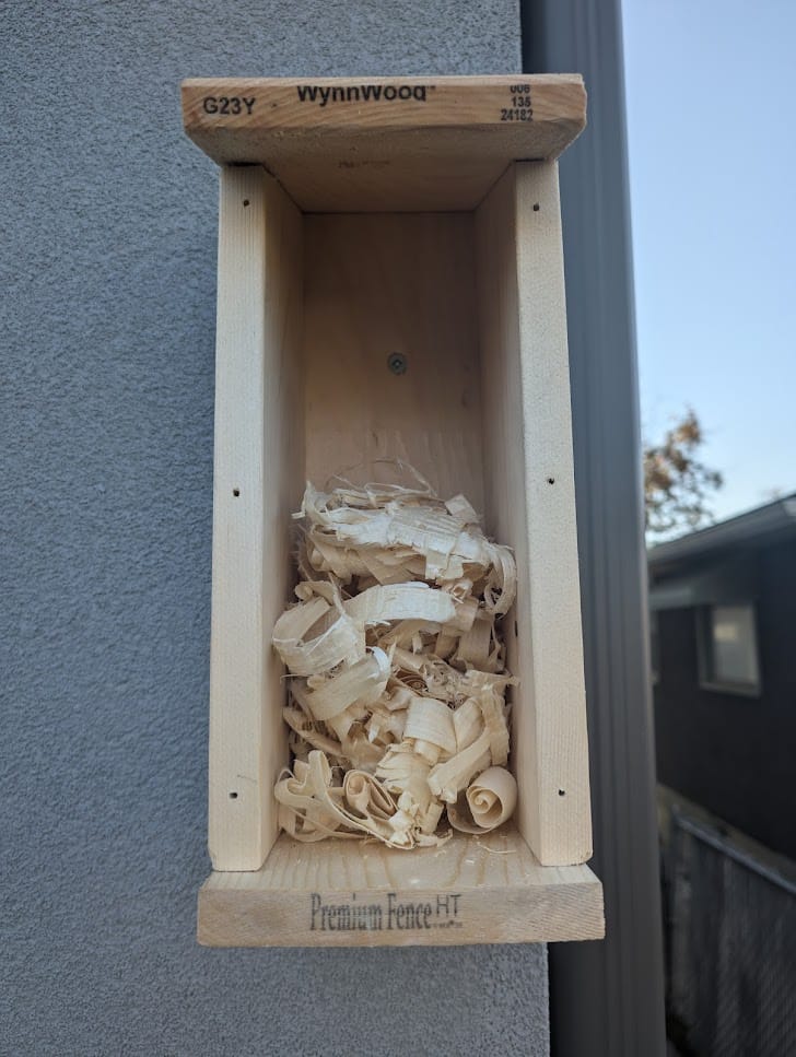 Antes de colocar el panel frontal, llené la casita con algunas virutas de madera que sobraban de otros proyectos. Quería hacerla lo más acogedora posible; algo que se sintiera natural y cómodo para un pequeño pájaro buscando calor a medida que se acercaba el invierno.